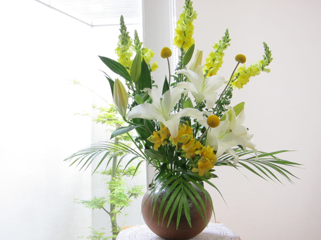 百合(ホワイト・パッション)、キンギョソウ、アザレア、ゴールデン・スティック